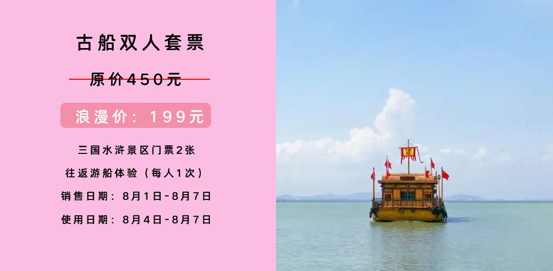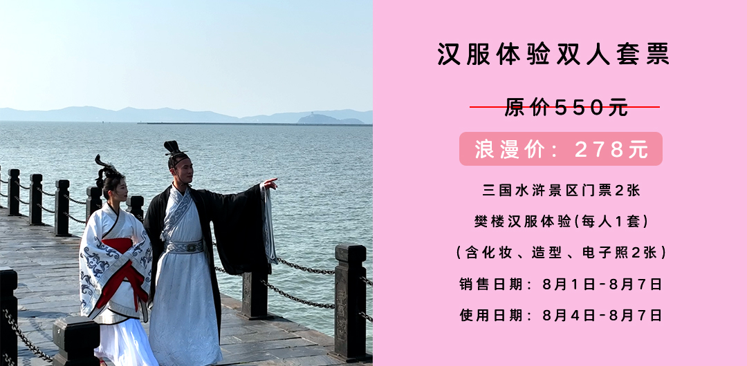 购买须知 :以上两款票型请至少提前一天订购,购票成功后需至三国水浒景区售票处取票,凭票进入景区,乘坐古船、拍摄古装照。