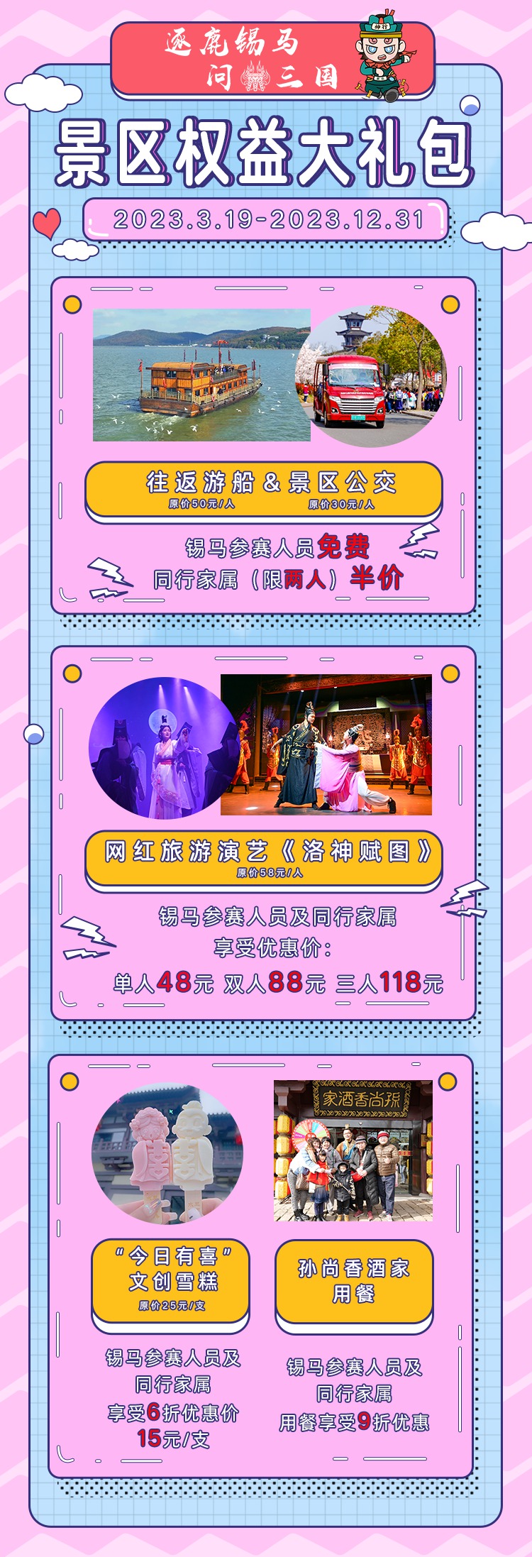 凭锡马参赛手环享受75元购三国水浒景区门票(原价175元)的优惠,同行家属(限两人)也享受此优惠。